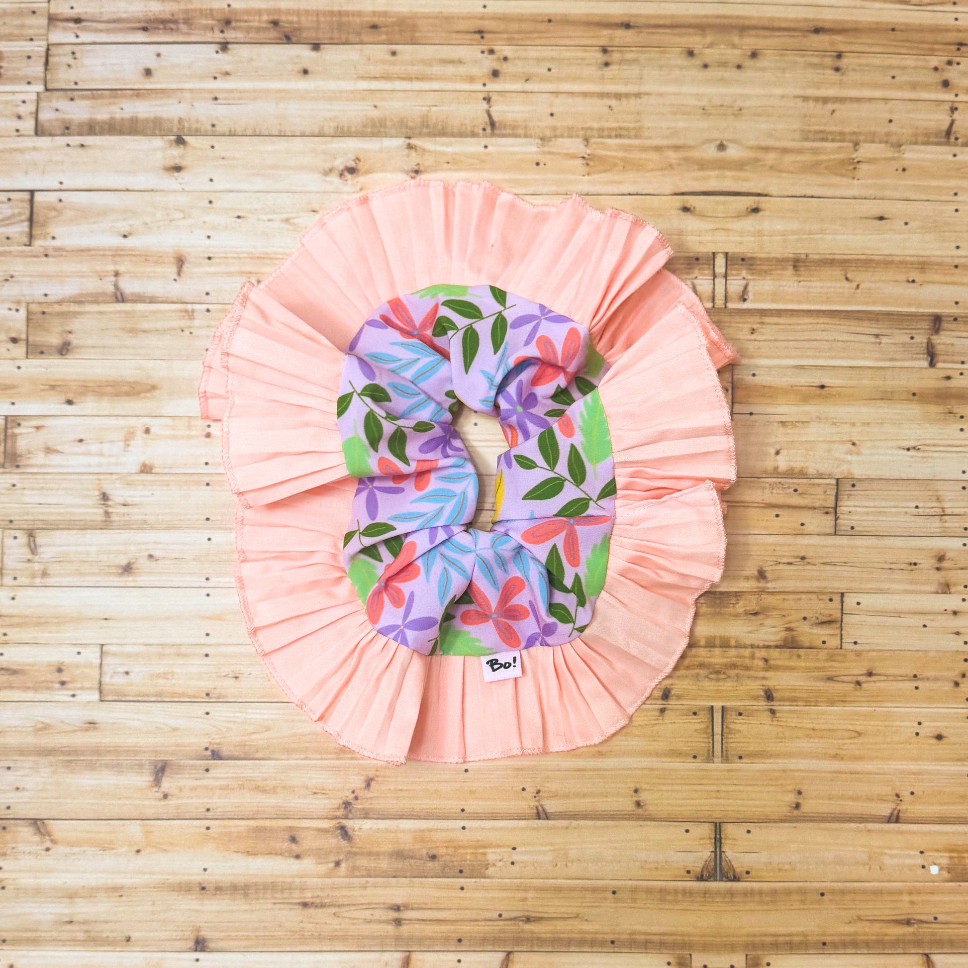 Coral, fucsia, verde hoja y lavanda, con una ola plisada en rosa melón que lo vuelve aún más delicado.