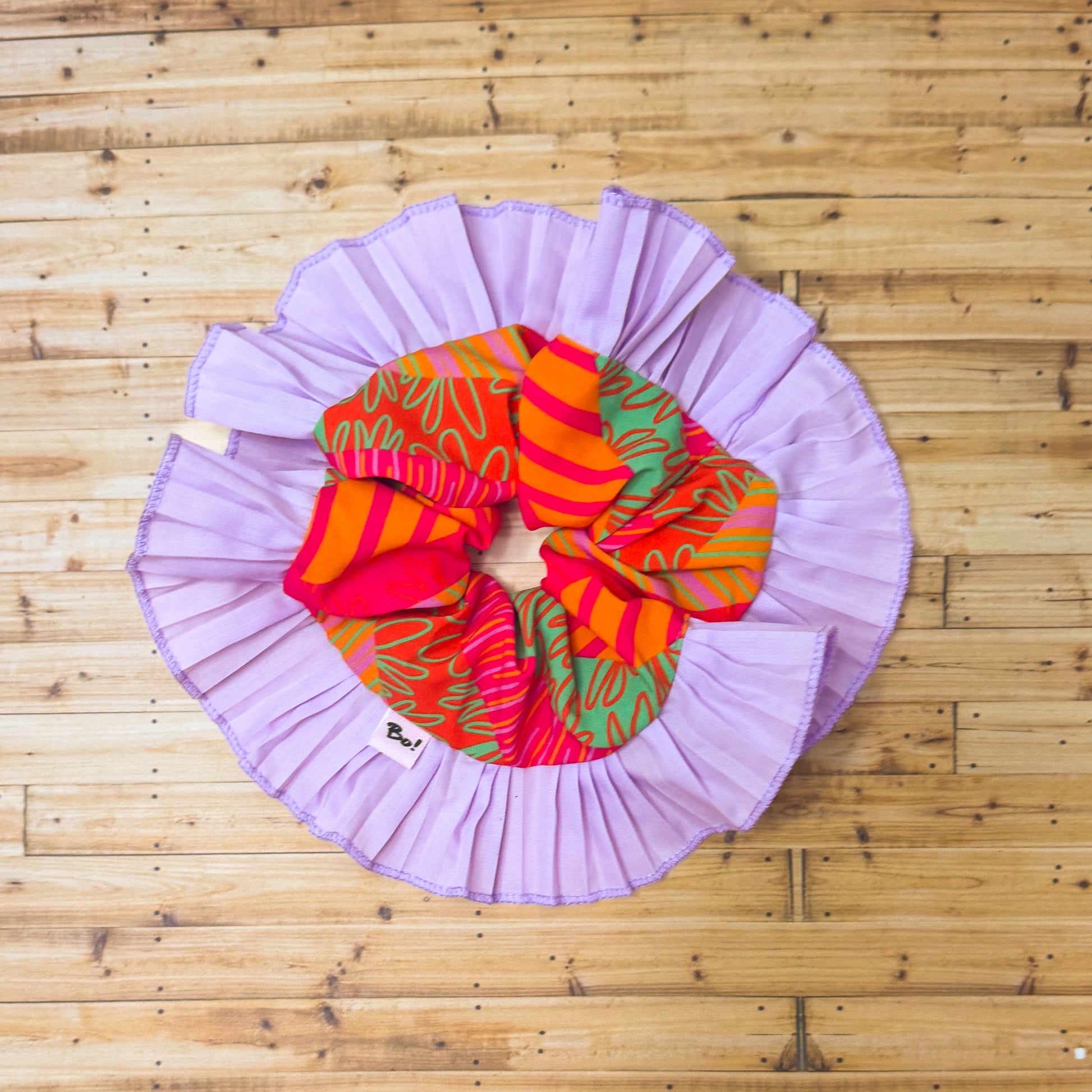 Fucsia, naranjo y verde con detalles abstractos sobre fondo coral. La ola plisada en lila le da el equilibrio justo entre locura y dulzura.