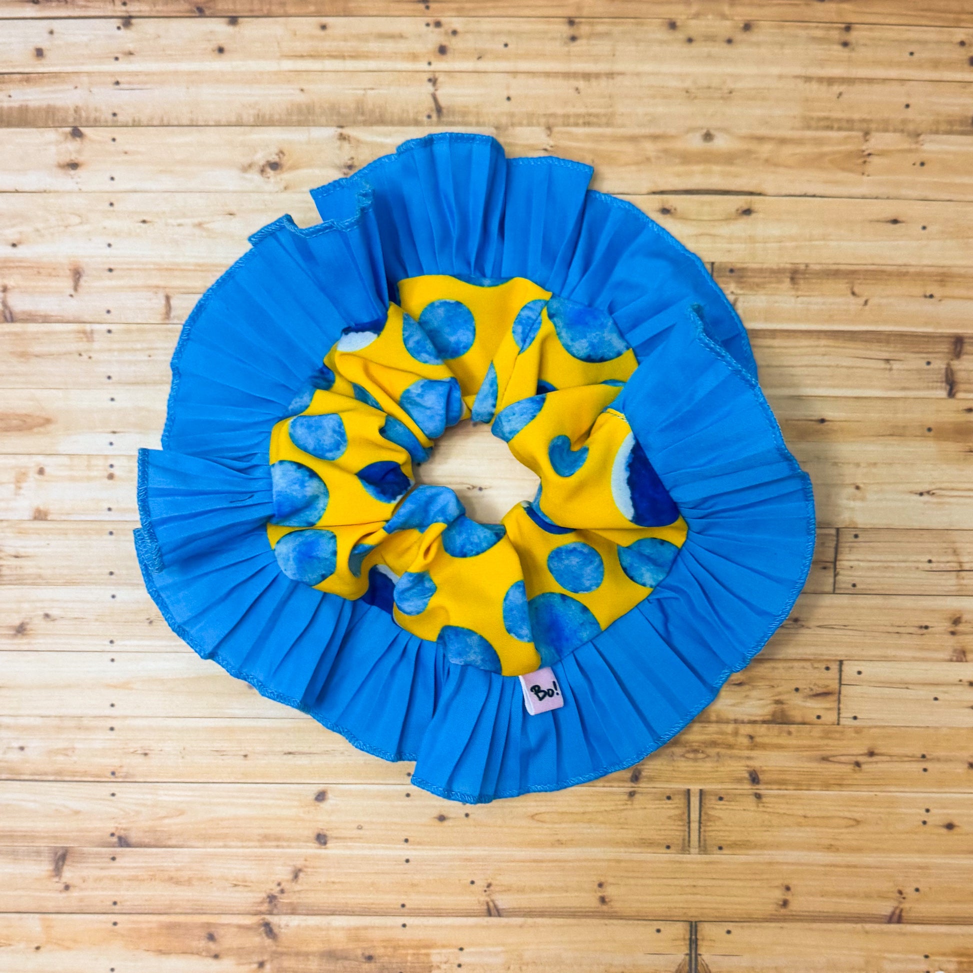 Fondo amarillo vibrante con burbujas azul índigo, enmarcado por una ola plisada azul cielo que lo hace aún más brillante.