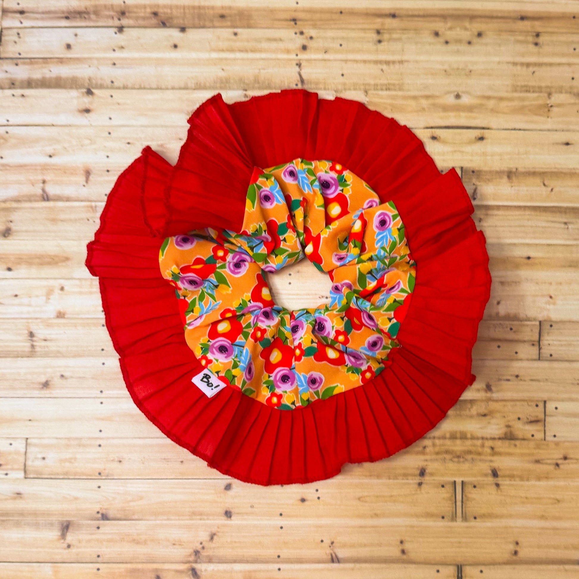 Fondo naranjo intenso con flores rojas, lilas y fucsias. Ola plisada en rojo pasión que remata el look con fuerza y carácter.