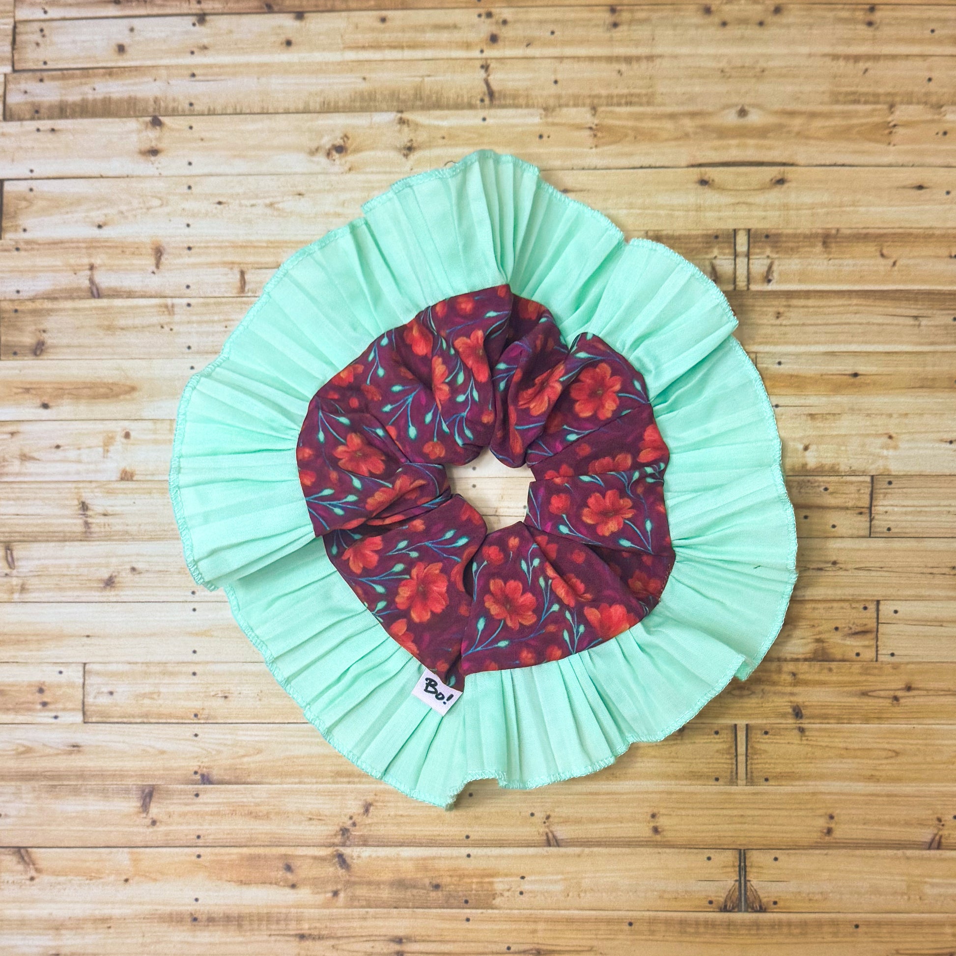 Flores cálidas y profundas sobre un fondo burdeo, rodeadas de hojas danzantes en verde agua. Un diseño que combina pasión con frescura.