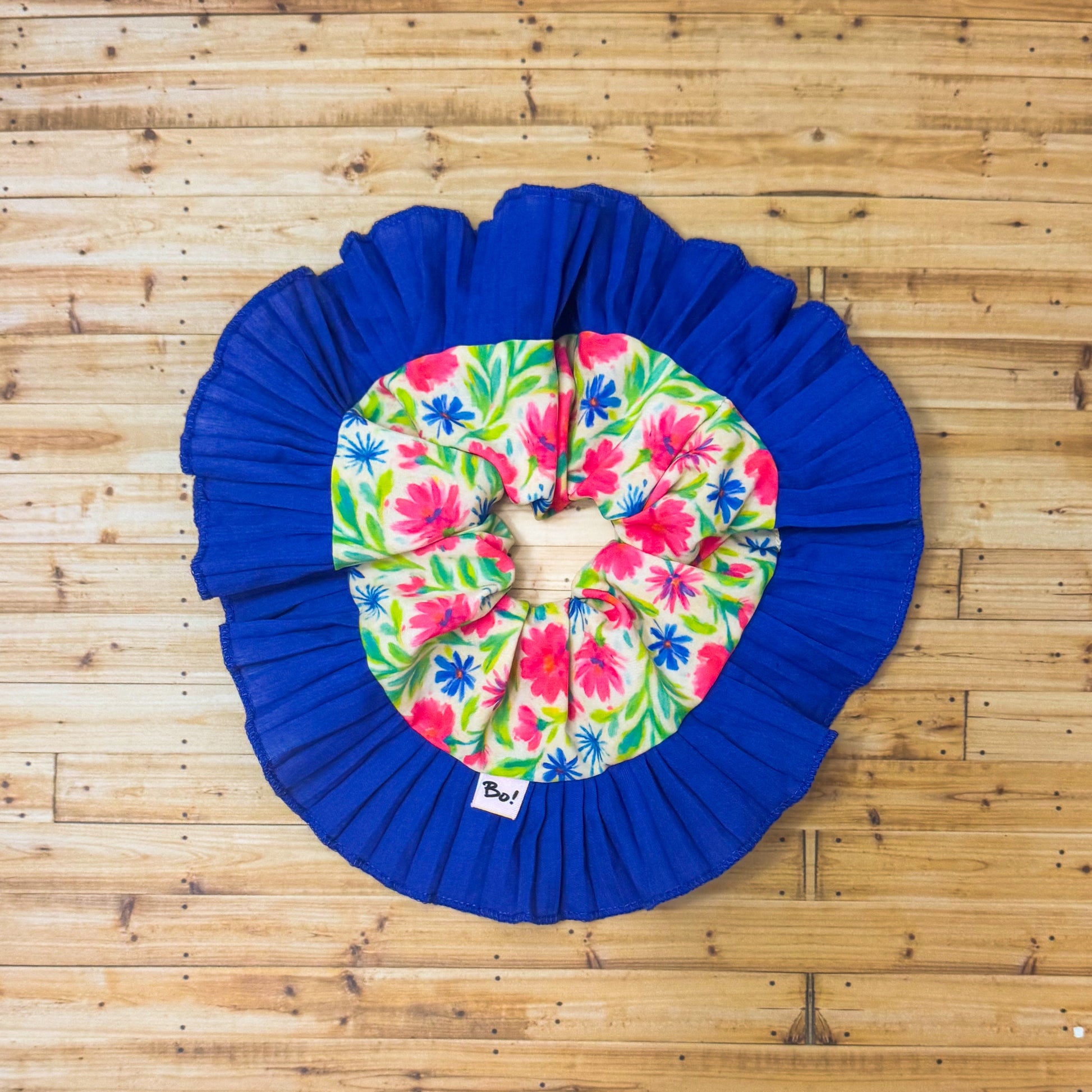 Fondo crema con flores fucsia, detalles en azul rey y verde hoja. Ola plisada en azul intenso que eleva todo con fuerza vibrante.