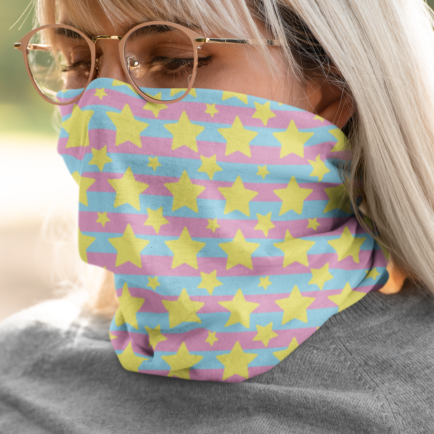 Una constelación de estrellas amarillas flotando sobre un cielo de franjas rosadas y celestes. Esta bandana es como un viaje al espacio más dulce y pop del universo. Ideal para espíritus soñadores, fans del color pastel y de los looks galácticos con sabor a chicle. 💫🍭🚀