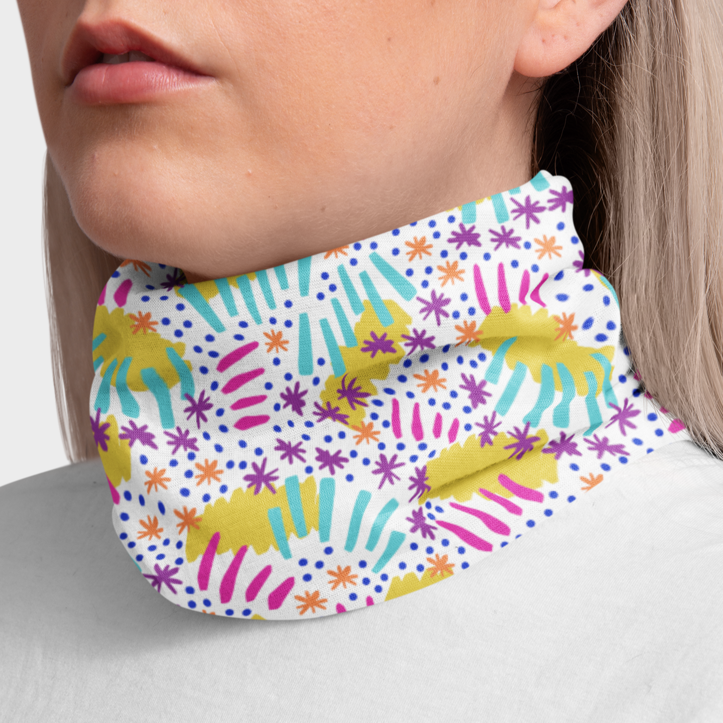 Trazos eléctricos, estrellitas y gotas de color sobre fondo blanco. Esta bandana es una explosión gráfica y vibrante que parece salida de una fiesta intergaláctica. Lúdica, chispeante y con energía de celebración constante. Ideal para quienes contagian alegría con solo aparecer.