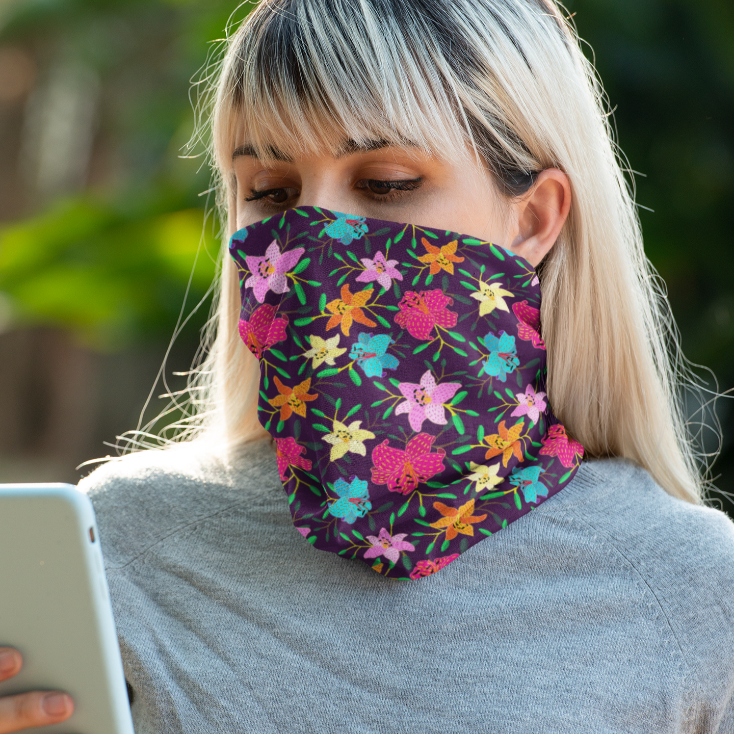 Fondo morado y flores coloridas que parecen bailar con el viento. Esta bandana es una fiesta botánica con aire tropical, alegre y chispeante. Para quienes llevan el calor y el ritmo en la piel, incluso en los días fríos.
