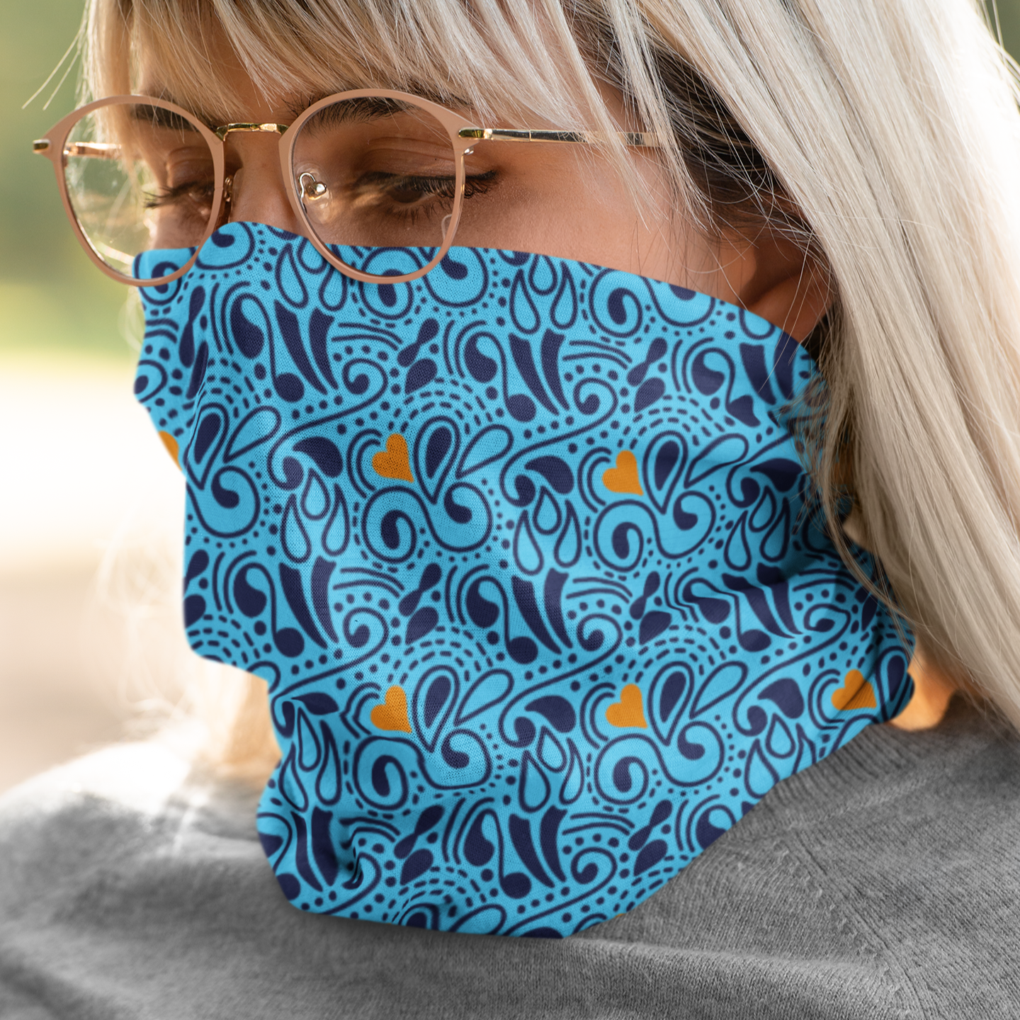 Fondo celeste vibrante con formas orgánicas en azul oscuro que se entrelazan como agua en movimiento, salpicadas por pequeños corazones color terracota. Un estampado que fluye con ritmo, mezcla de ternura y energía, ideal para quienes sienten fuerte y viven intensamente.