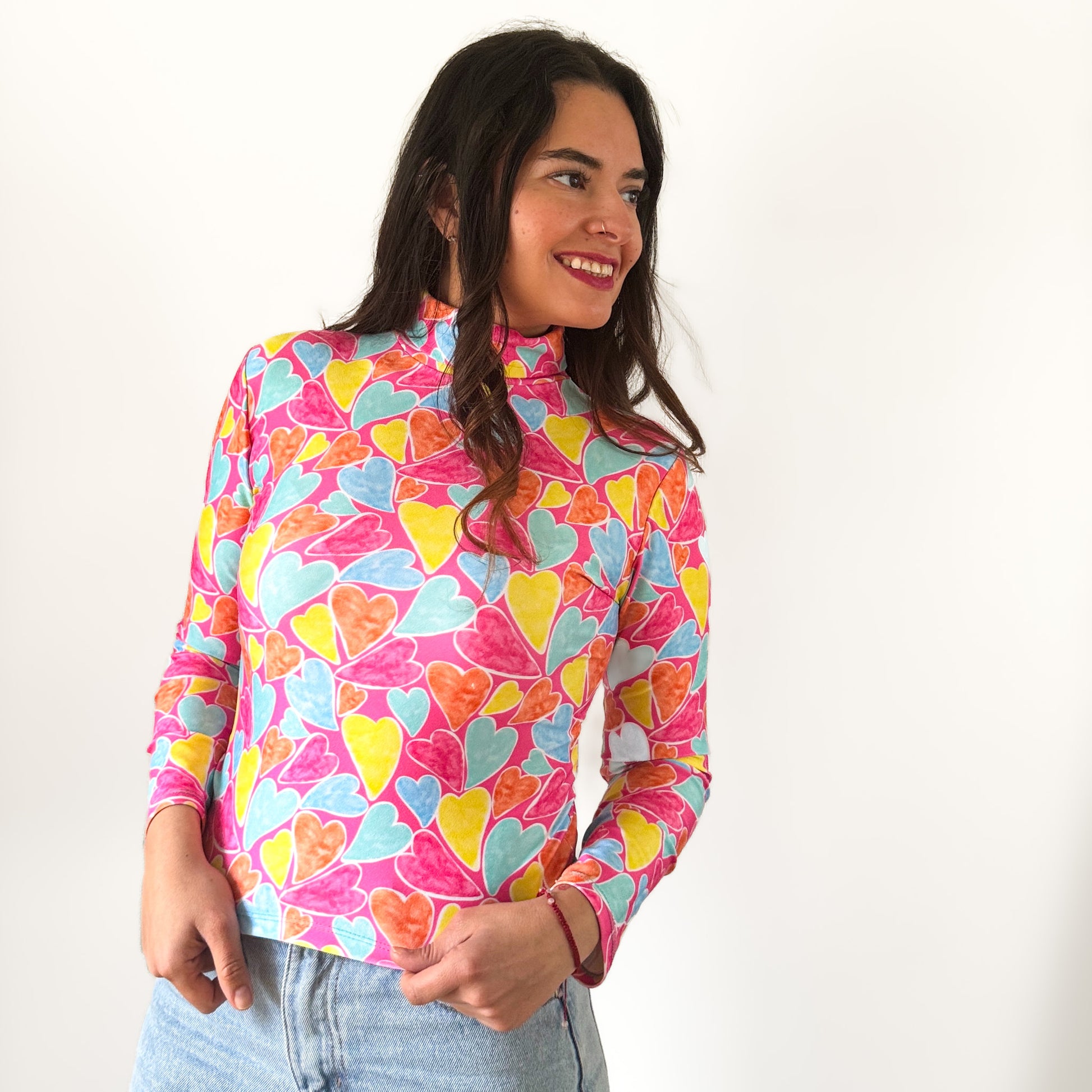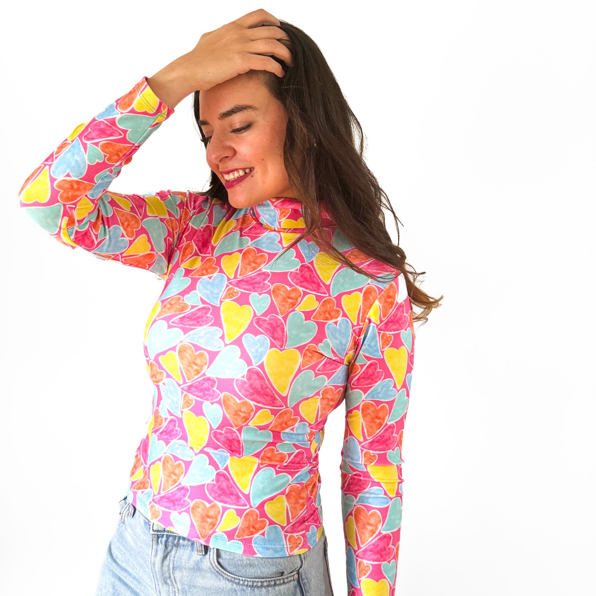 Rompecorazones es puro amor en technicolor. Una lluvia de corazones en tonos rosados, turquesa, amarillo y naranja que parece dibujada con plumones sobre un fondo alegre y luminoso. Un diseño explosivo que vibra con alegría y dulzura.