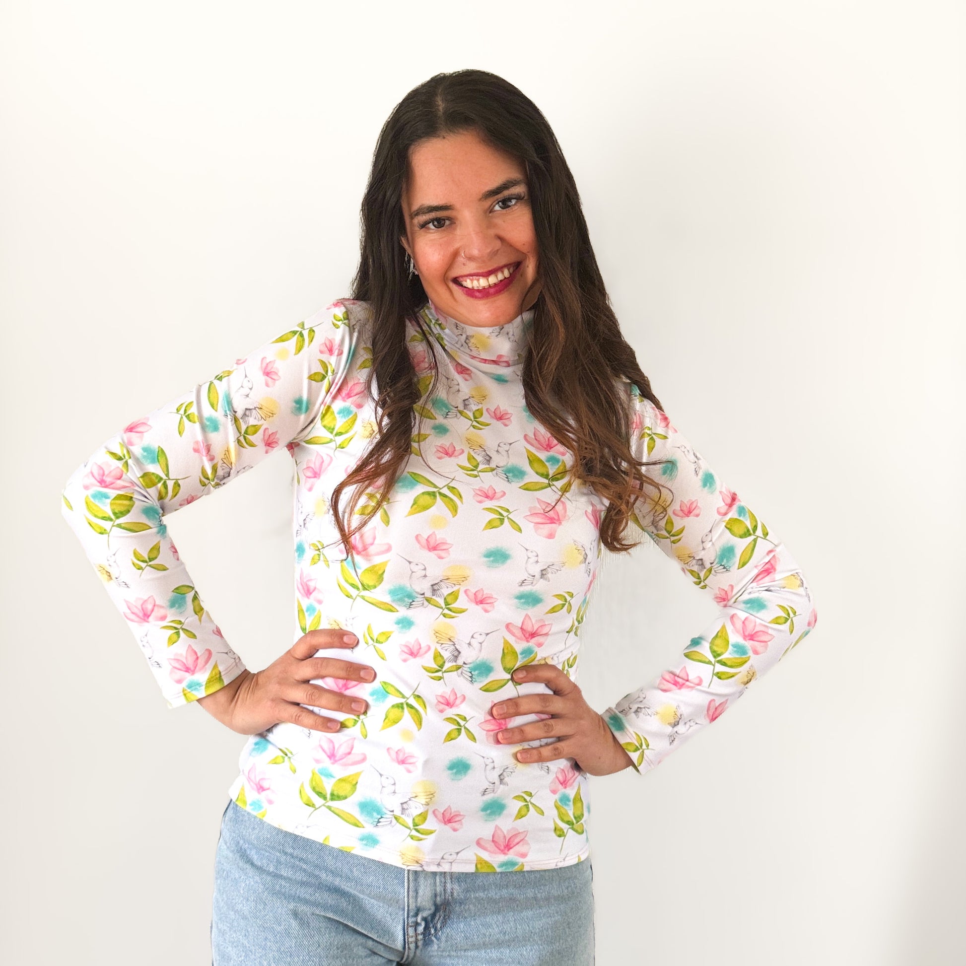 Un jardín acuarelado lleno de flores suaves y pajaritos escondidos entre hojas. La base blanca le da luz a cada pincelada, creando una armonía delicada y serena.