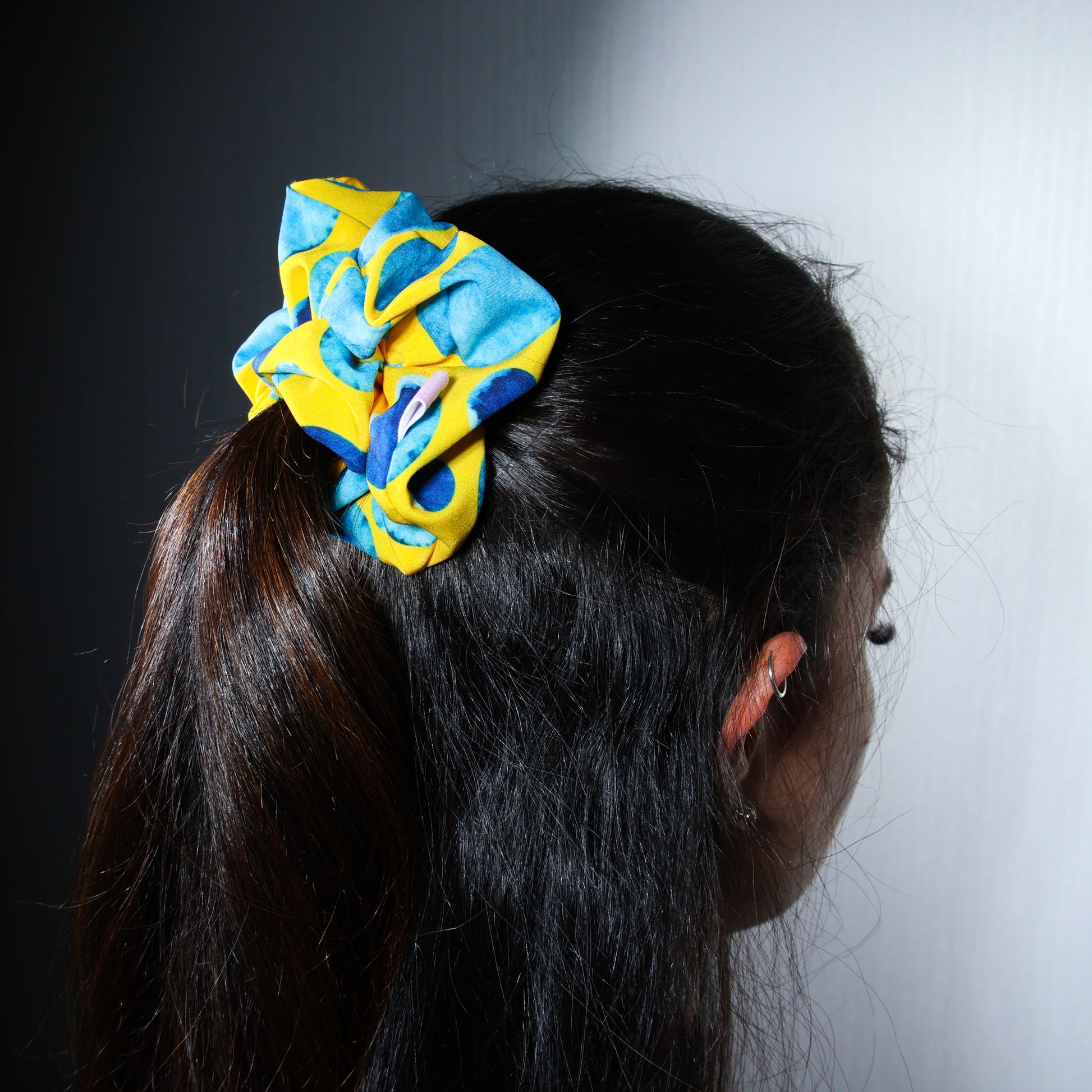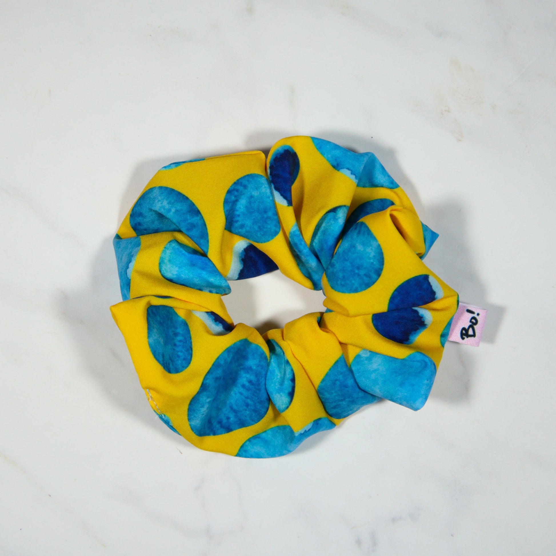 El collet “Burbuja Solar” es para quienes se atreven a jugar con el color: un diseño con burbujas azules sobre un fondo amarillo vibrante que transforma cualquier peinado en un toque divertido y único.
