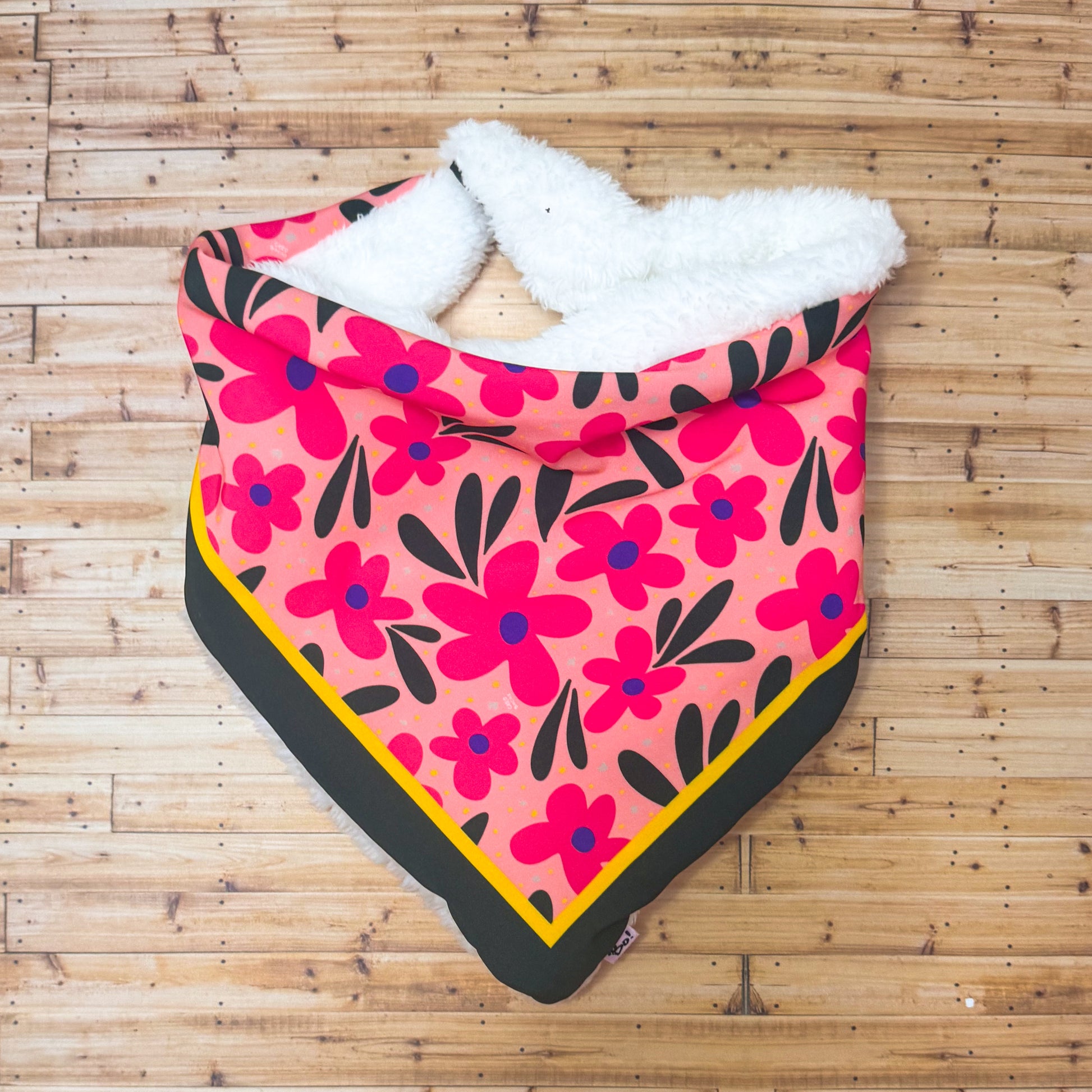 Flores fucsias y moradas que parecen estallar sobre fondo rosado chicle. Un jardín con esteroides, dulce pero con carácter. Ideal para las que no temen florecer en modo ataque.
