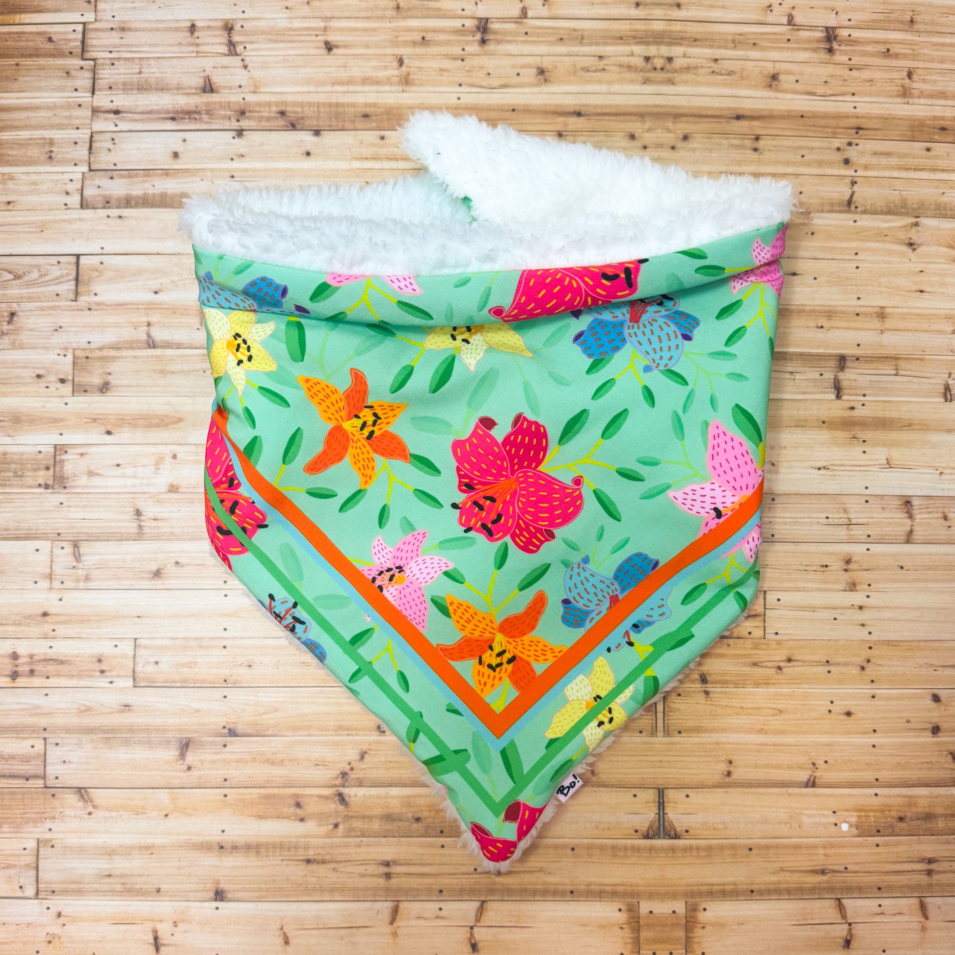 Un jardín tropical florece sobre fondo verde suave. Las flores en fucsia, naranja, celeste y rosado vibran como si bailaran al ritmo del Caribe. Cada pétalo parece haber sido pintado con pinceladas de alegría y calor.