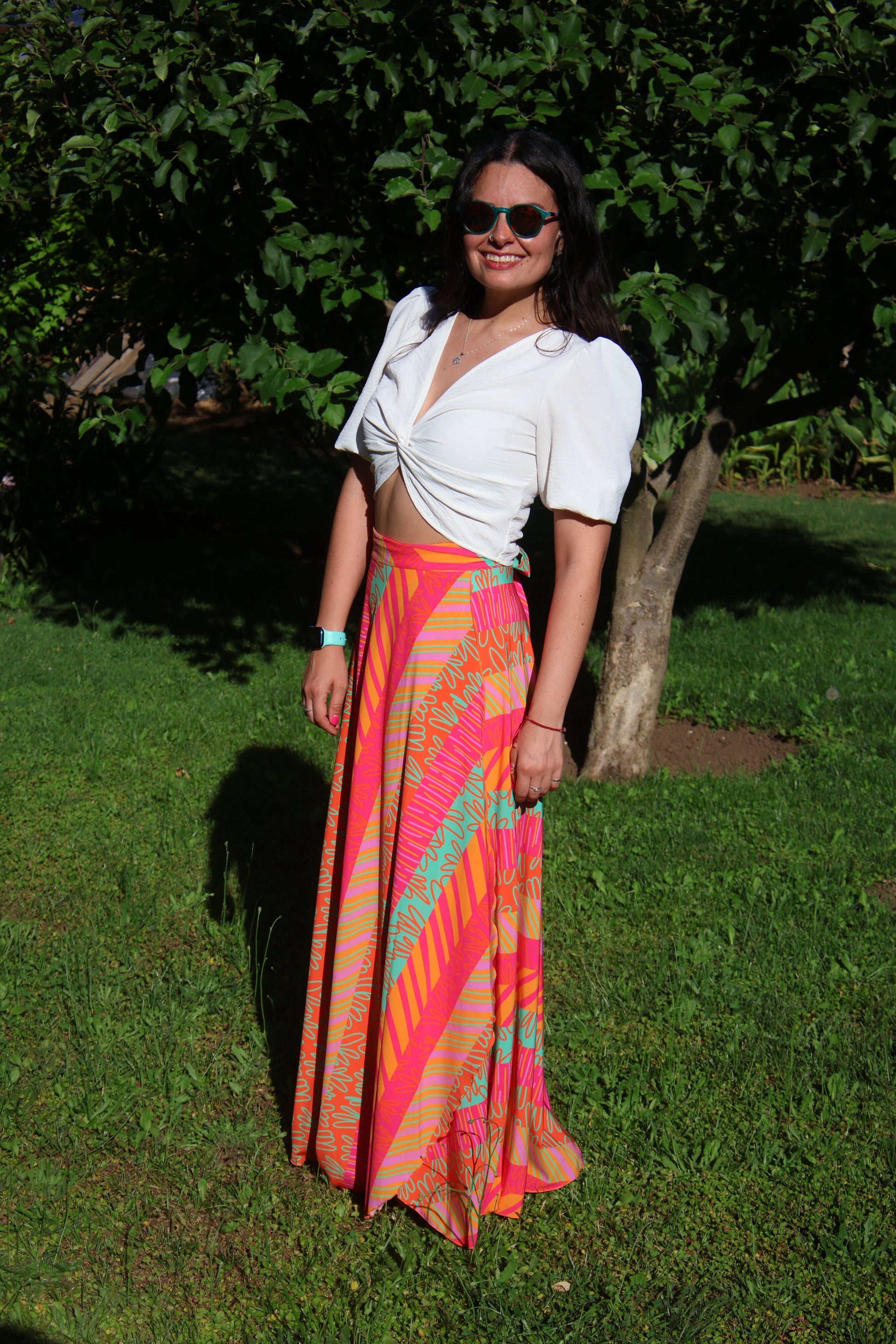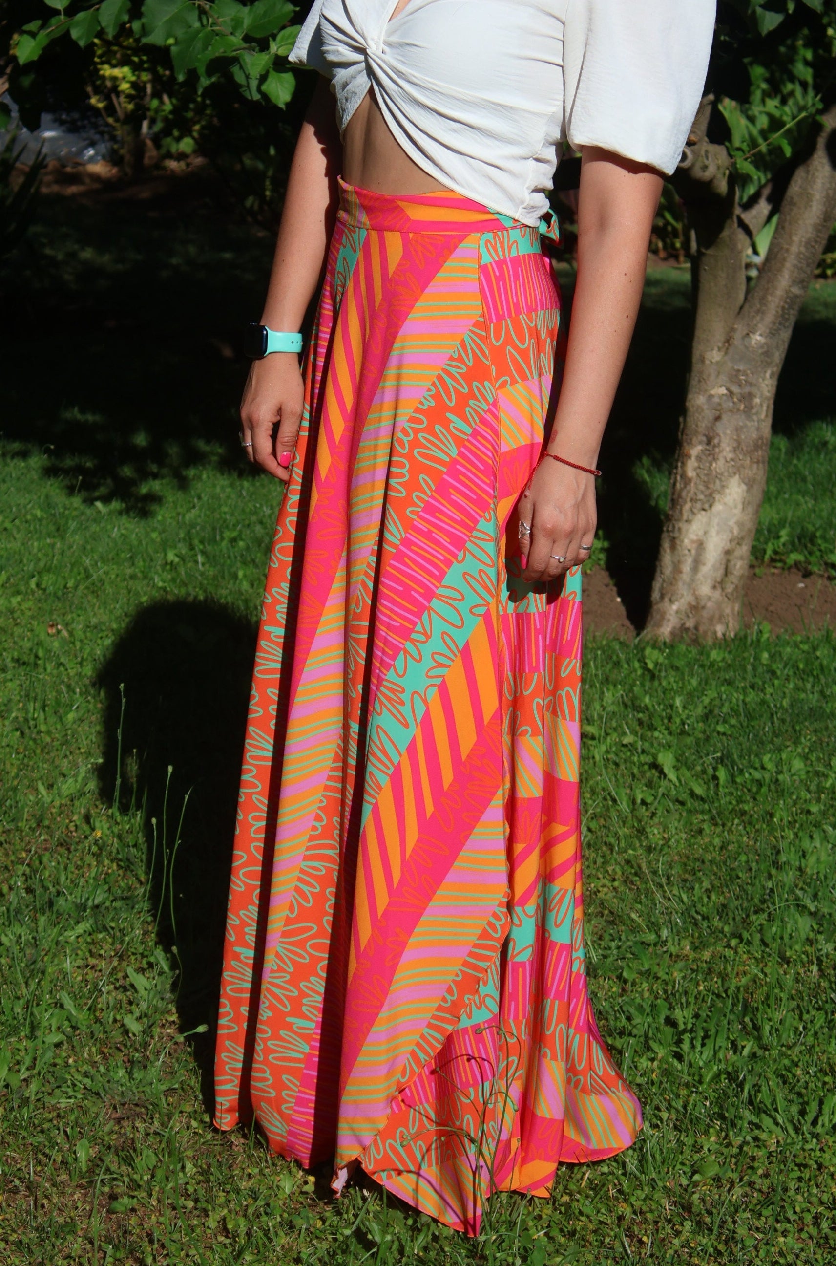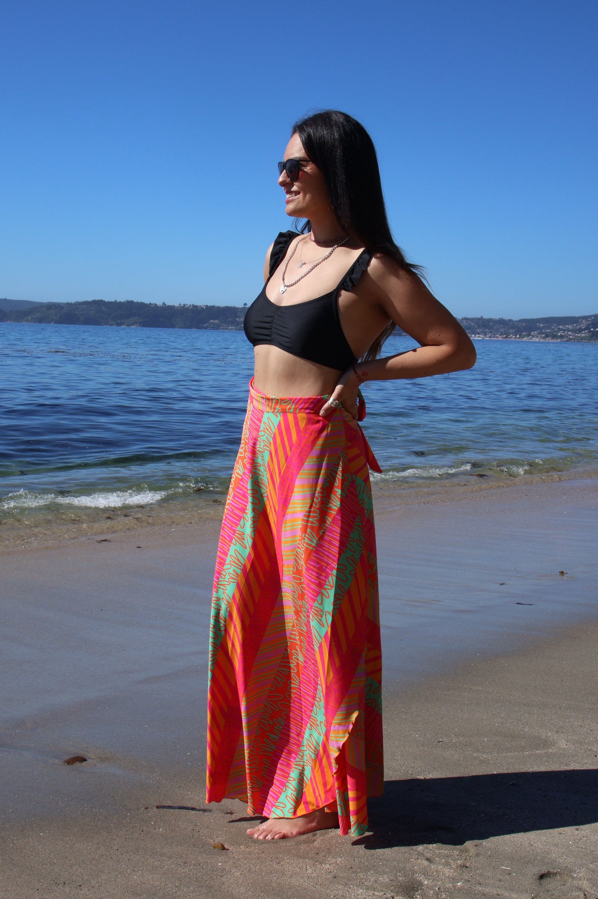 Perfecta para quien ama destacar. El formato envolvente realza la cintura y aporta un movimiento espectacular al caminar. “Mica” es esa falda que transforma un outfit simple en EL look del día. Ideal con tops blancos, poleras básicas, sandalias o incluso zapatillas para un look urbano con mucha onda.