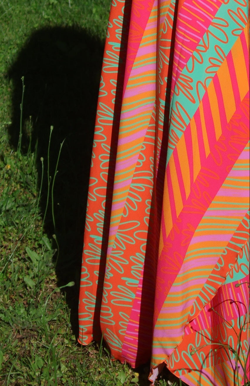“Mica” es explosión de color, movimiento y actitud. Su composición mezcla líneas diagonales, trazos libres y patrones vibrantes que crean un efecto visual hipnótico. El diseño combina tonos naranjos, rosados intensos, amarillos luminosos y detalles en verde menta, logrando un look moderno, atrevido y lleno de vida.