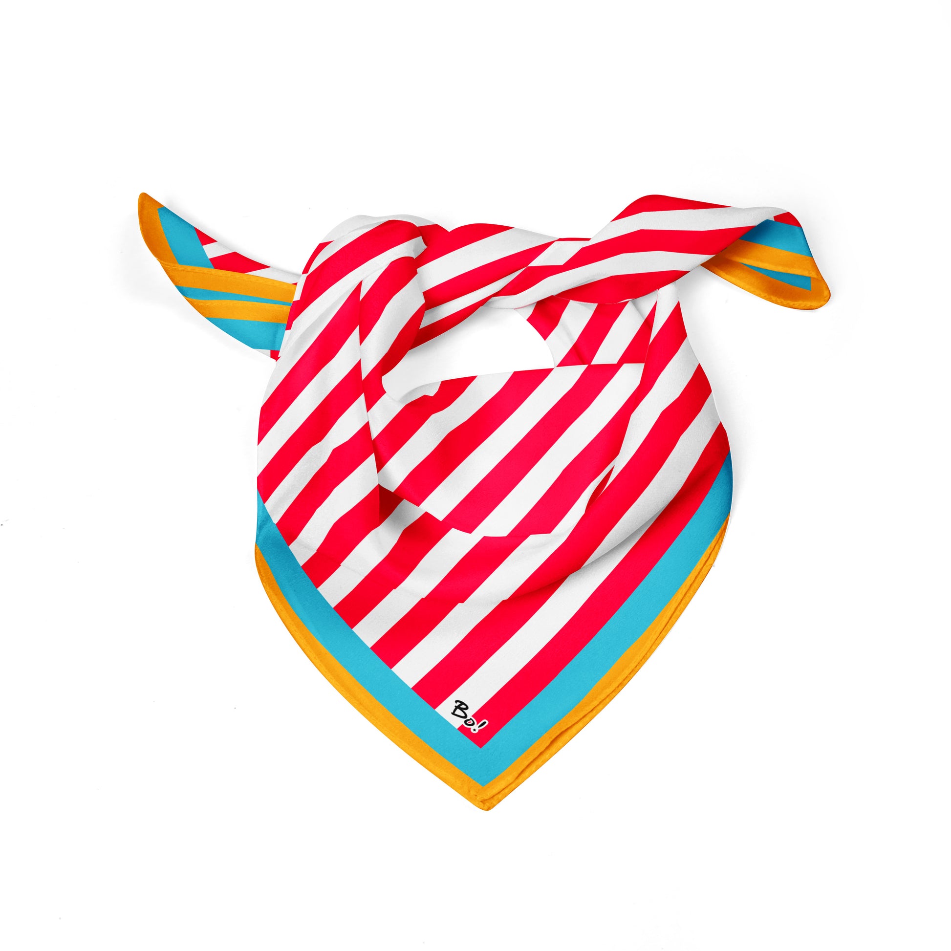Rayas diagonales en rojo y blanco con un borde en celeste y amarillo que rompe lo clásico con un toque vibrante. Un diseño que mezcla lo marinero con la frescura tropical, ideal para looks llenos de energía.