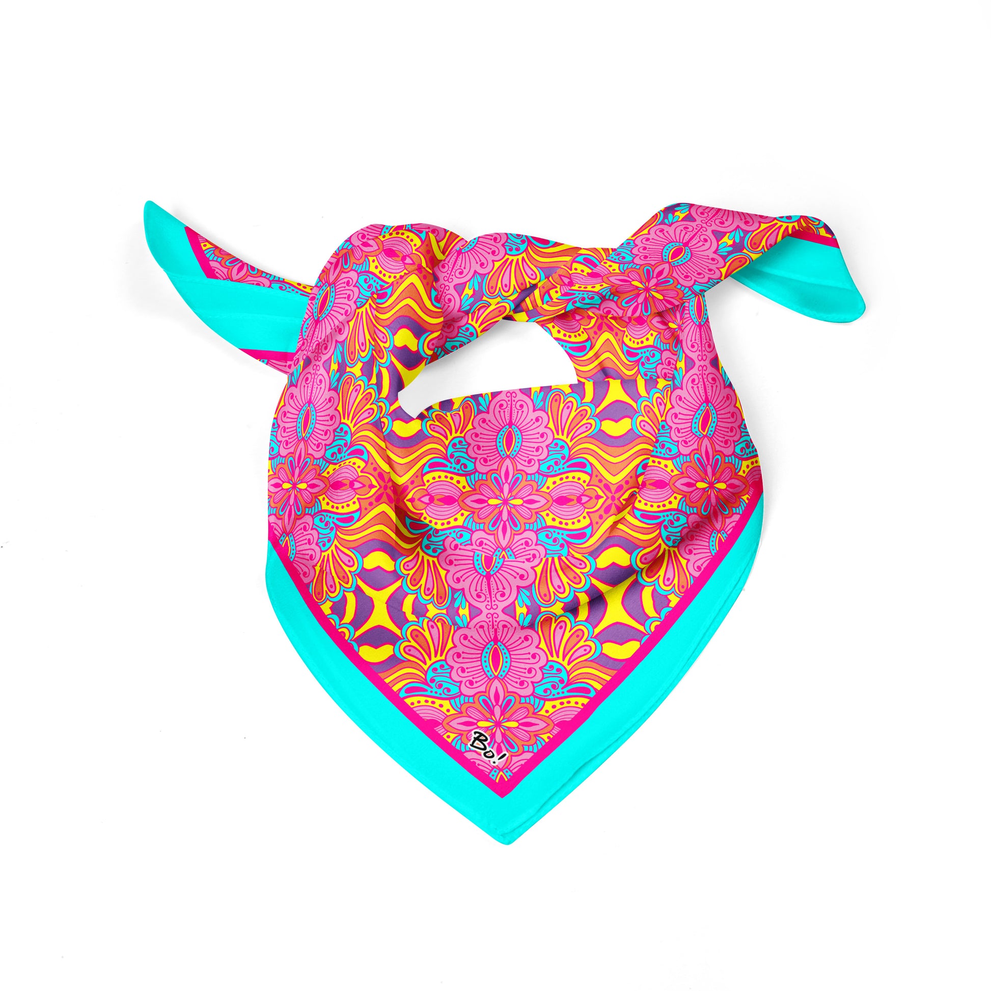 Estampado psicodélico con inspiración boho, lleno de formas florales y ondas retro que vibran con intensidad. Es un pañuelo que parece bailar con luz propia.