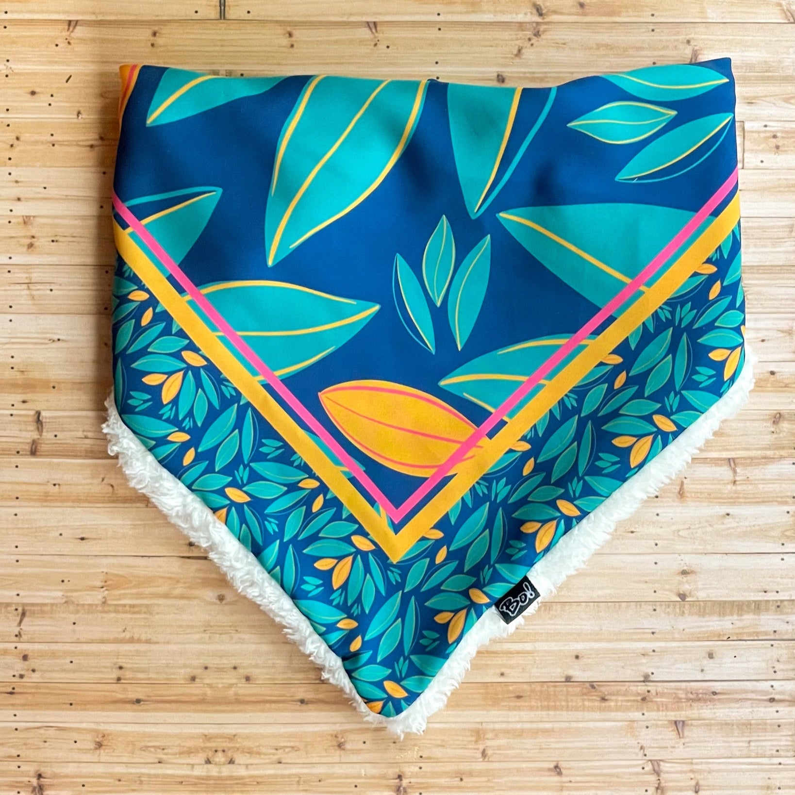 Azul eléctrico como base, con hojas en turquesa, verde selva, amarillo mango y detalles rosados que sorprenden.