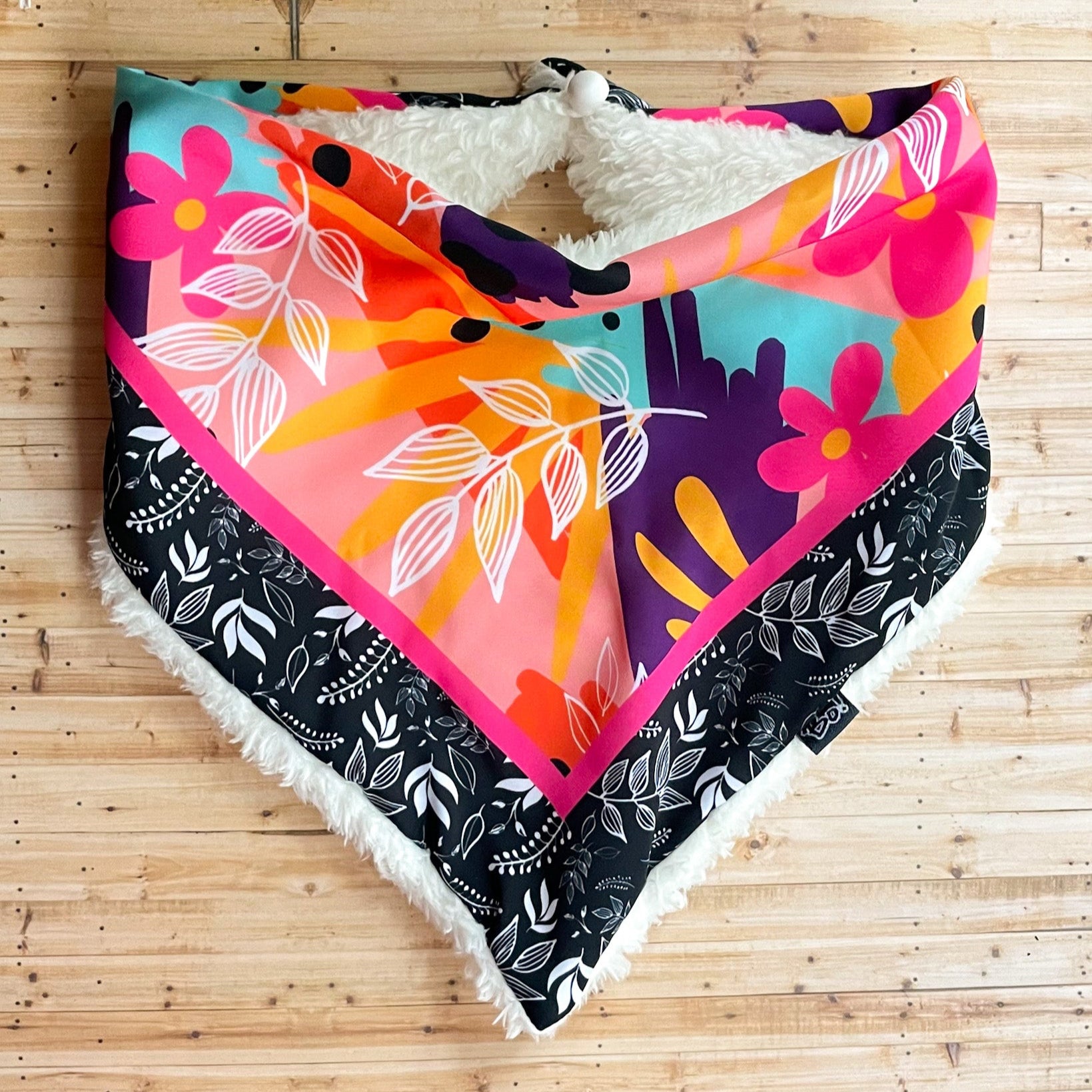 Fucsia, coral, naranjo, morado, turquesa y blanco, con un marco negro que le da fuerza y contraste. Atrás, corderito blanco ultra suave para resistir cualquier ventisca.