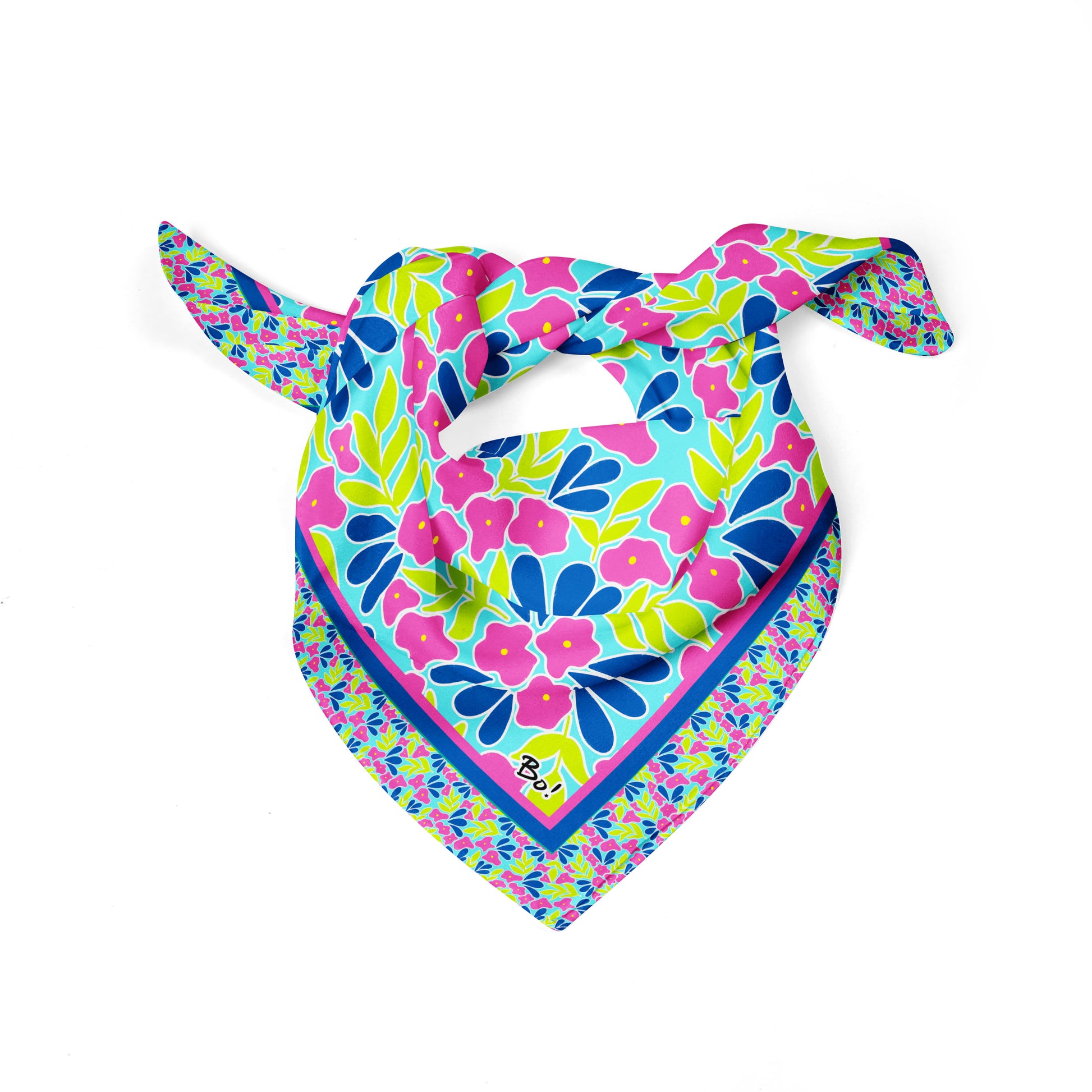 Un estallido floral sobre fondo calipso que combina flores fucsias, hojas verdes y detalles en azul profundo. Un diseño vibrante que parece cargado de energía, como un jardín iluminado por luces de neón.