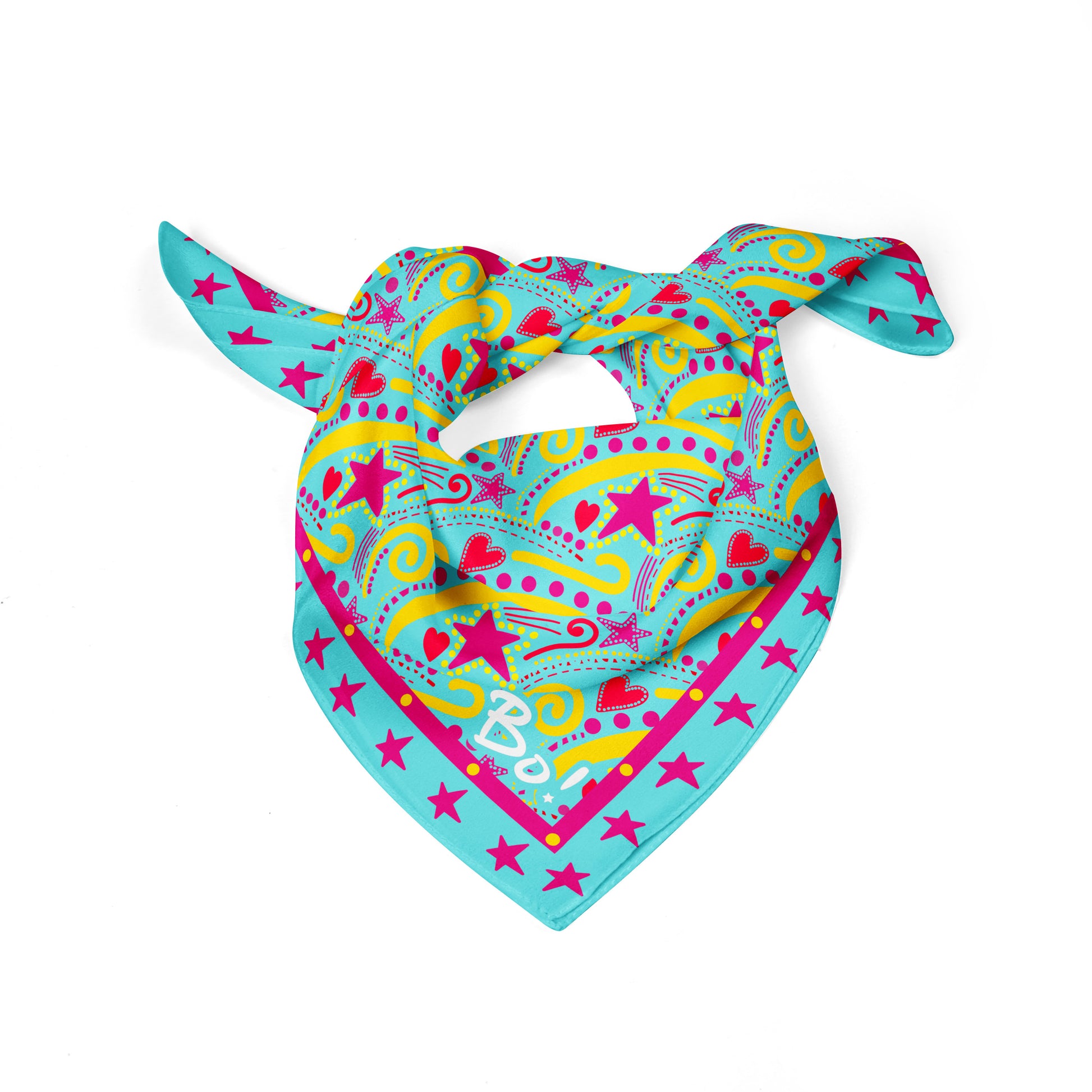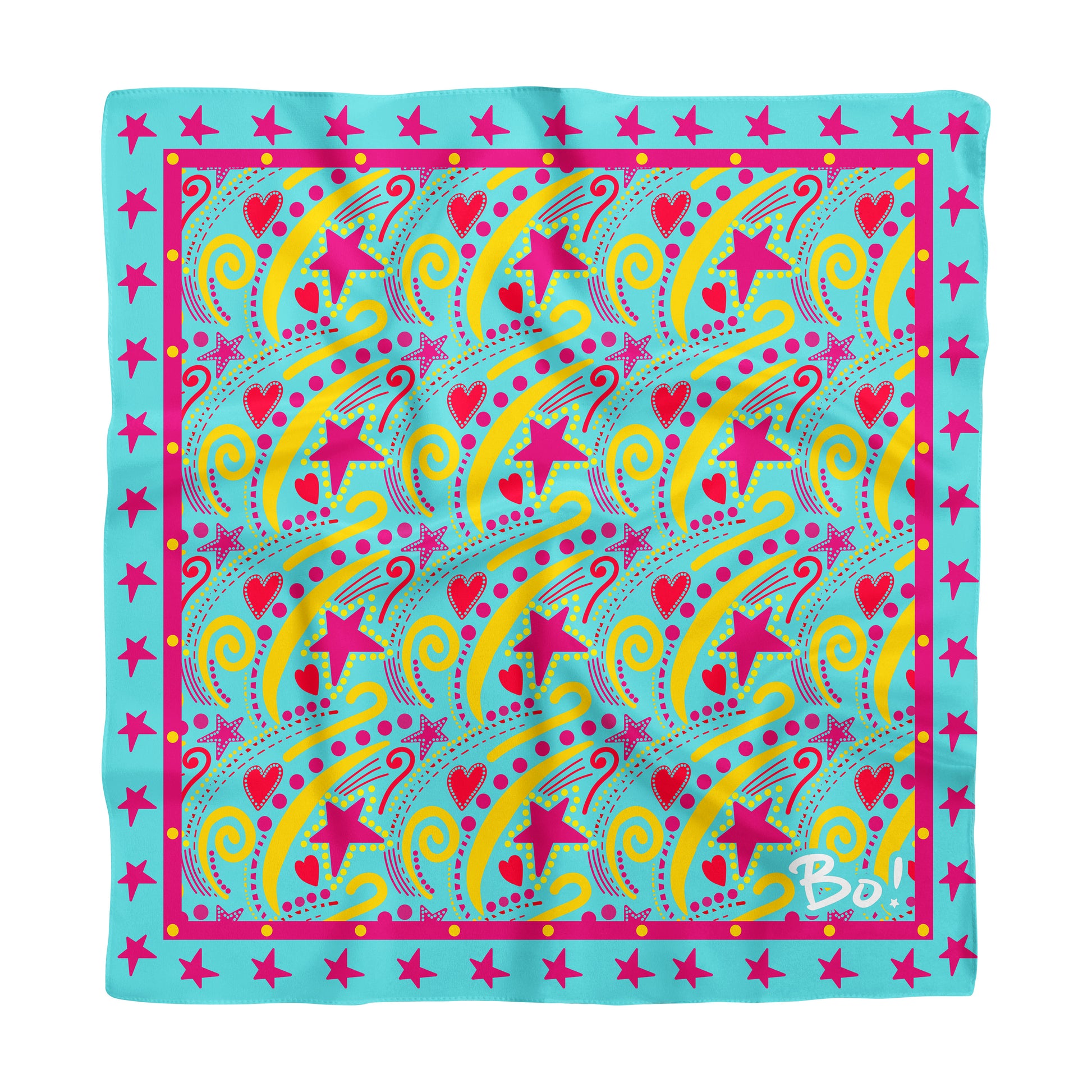 Pañuelo cuadrado estampado con diseño en colores rojo, amarilo y fucsia. Predominan las estrellas y corazones.