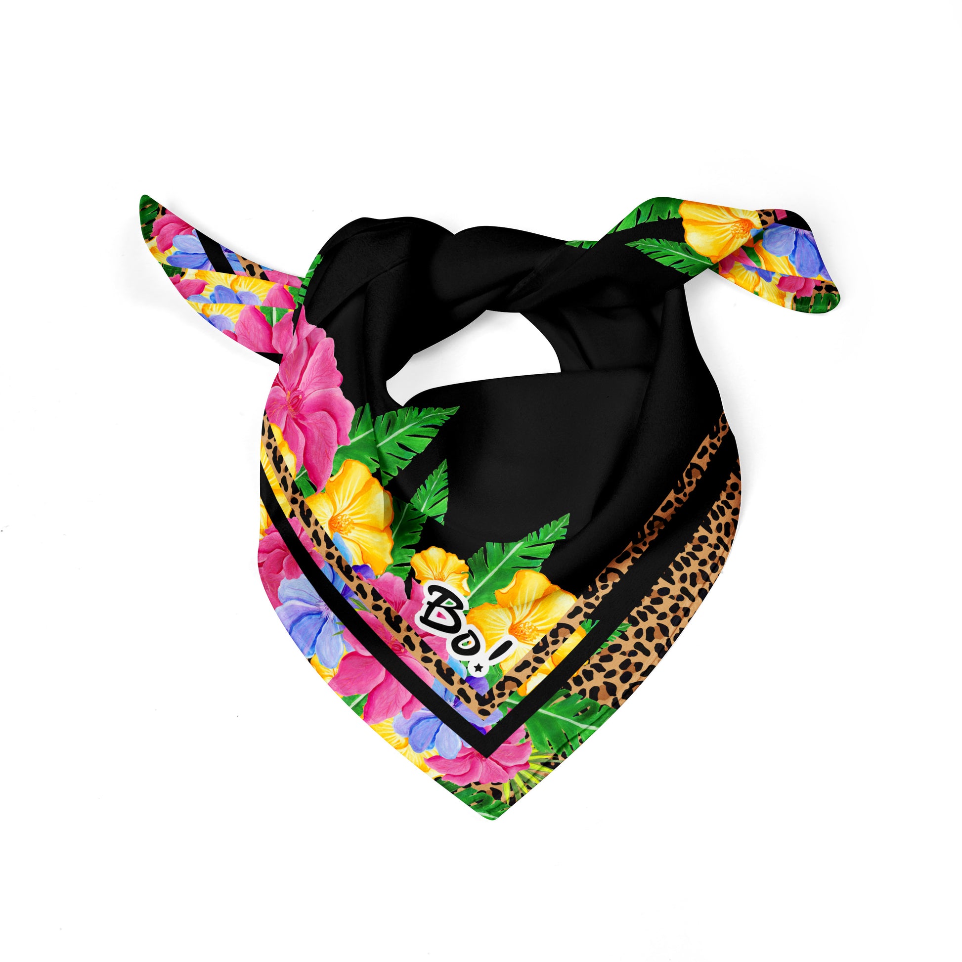 Pañuelo cuadrado estampado con nuestra clásica mezcla de diseños print y flores, rediseñado para que sea aun más hermoso!!
