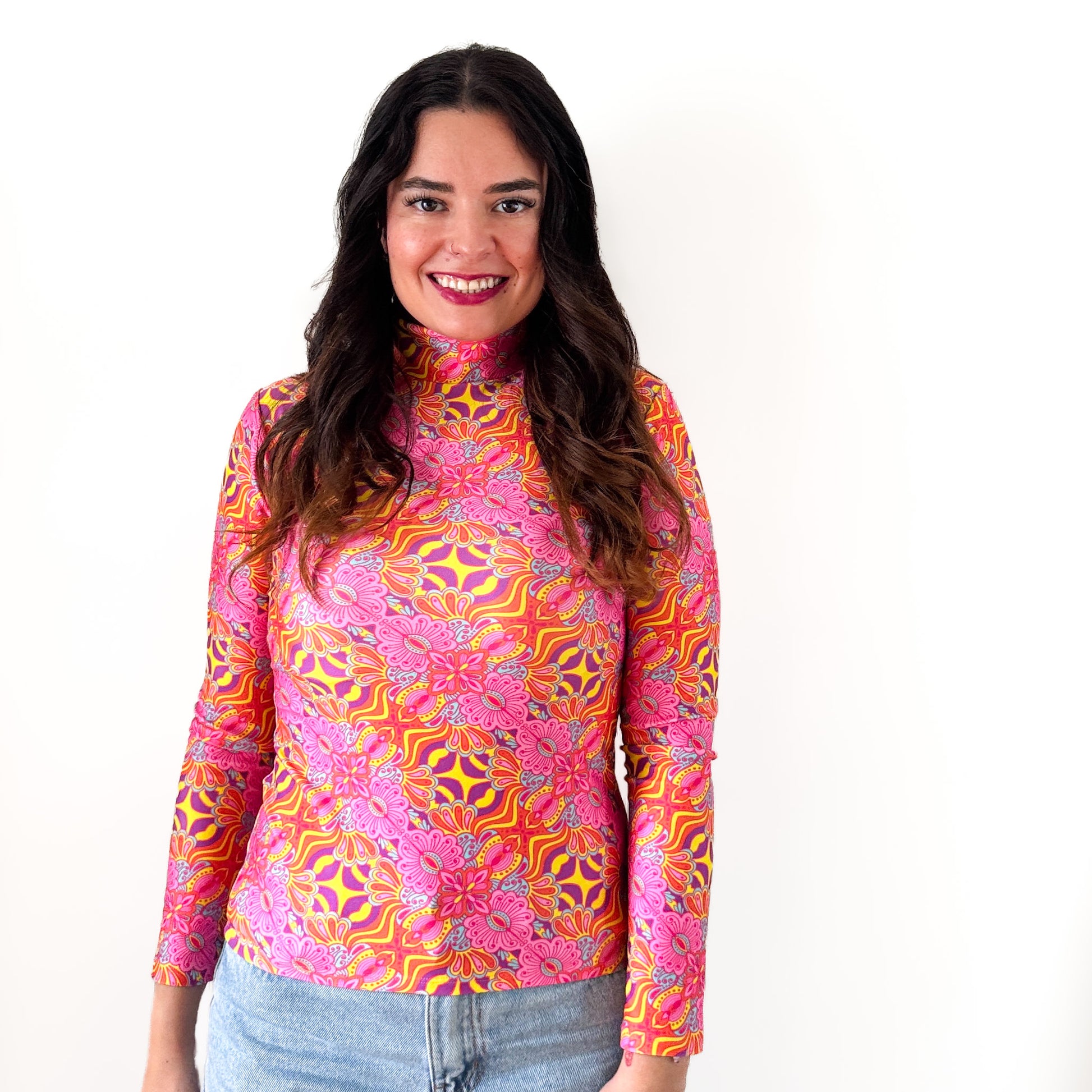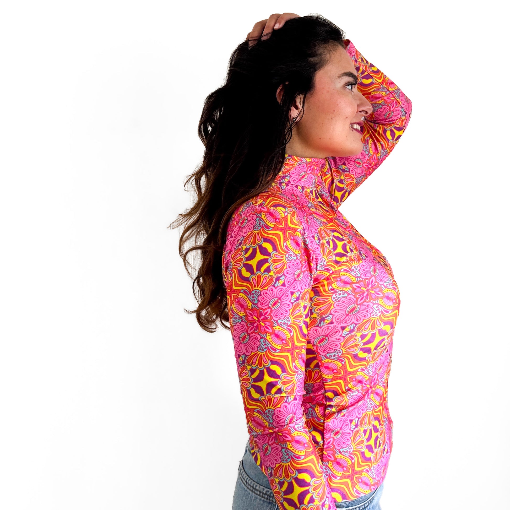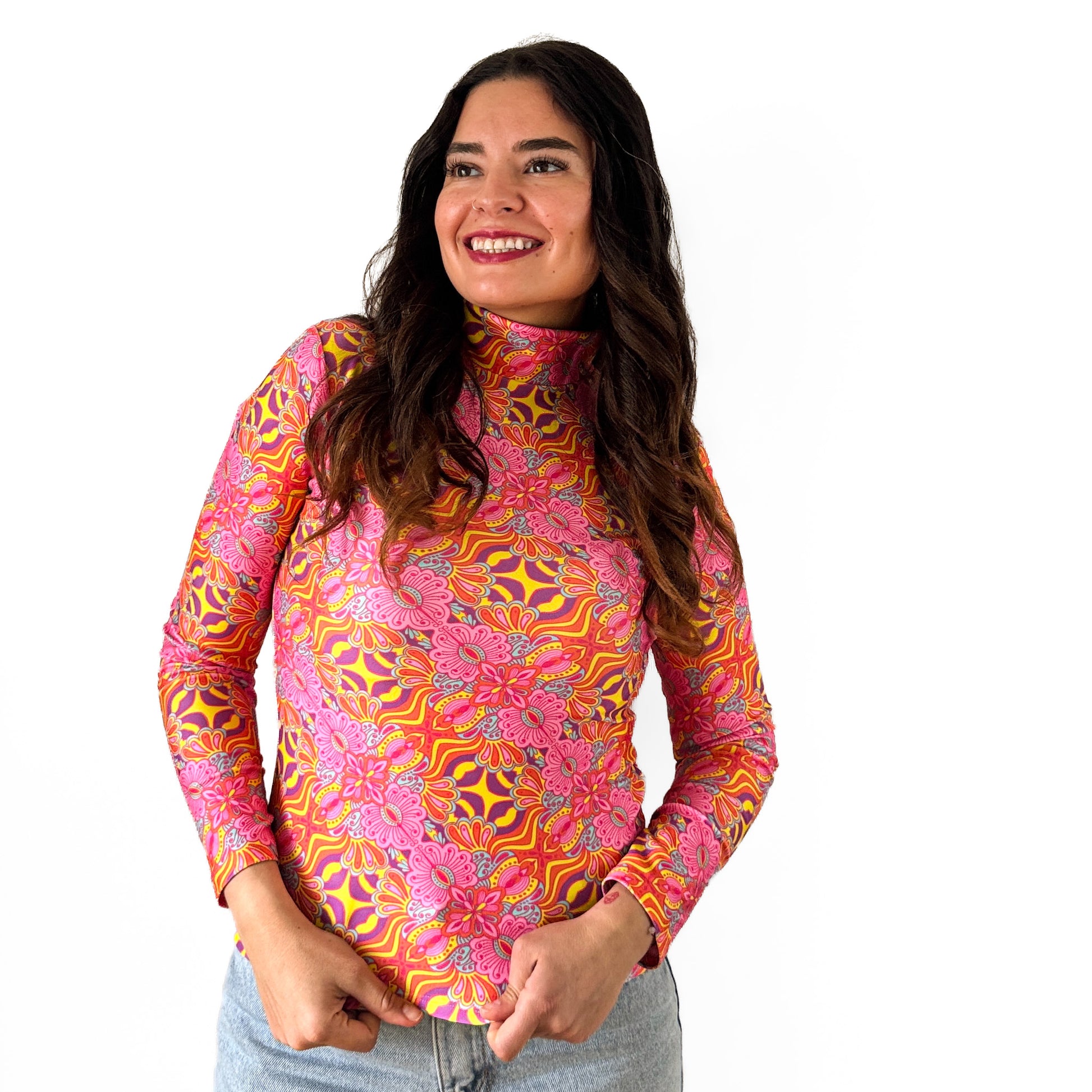 El cuello alto te abriga, la tela flexible se adapta a tu cuerpo y el calce ajustado te hace sentir segura y con toda la onda.